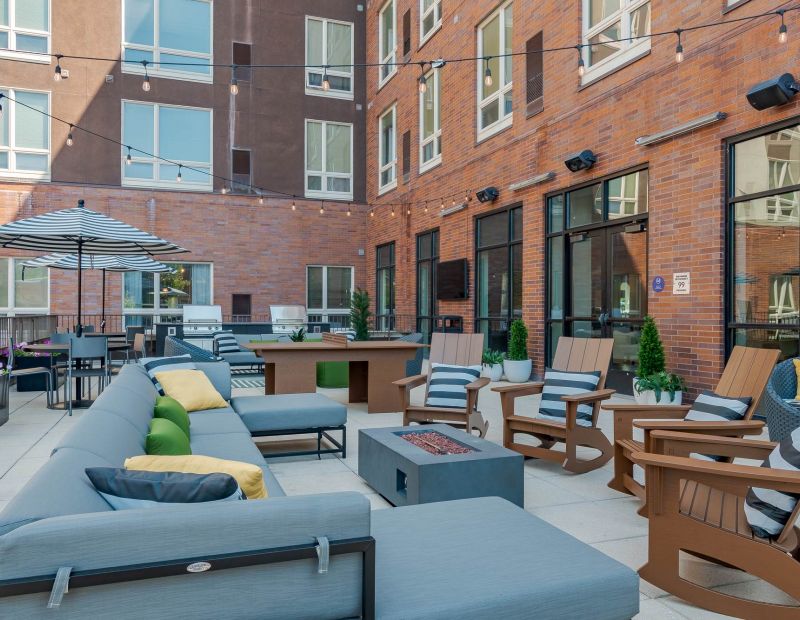 The outdoor lounge at District Flats is designed for connection and comfort—with cozy seating, warm lighting, and a crackling fire pit that turns any evening into a moment worth staying for.