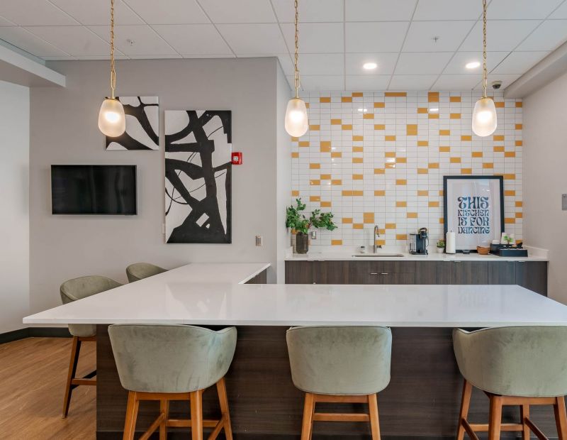 Fuel your day or unwind with friends in our modern community lounge—complete with sleek countertops, bar seating, and cozy lighting that sets the perfect mood. Whether it’s morning coffee or late-night study snacks, this space is designed for comfort and connection.