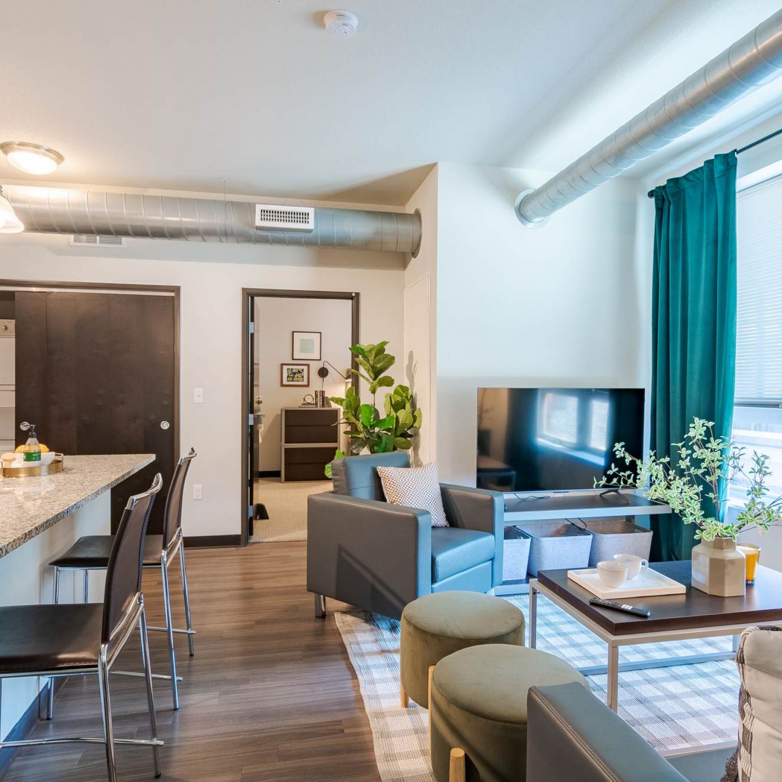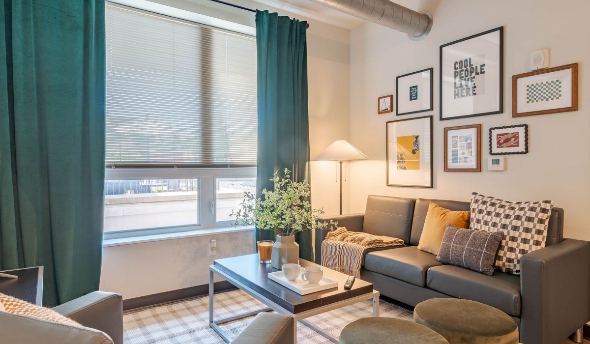 Every apartment at District Flats offers a warm, modern living area designed for both comfort and connection—complete with stylish furnishings, oversized windows, and room to relax or recharge. Whether you’re streaming your favorite show, hosting friends, or enjoying a quiet night in, this is your place to feel at home in the heart of Columbia.